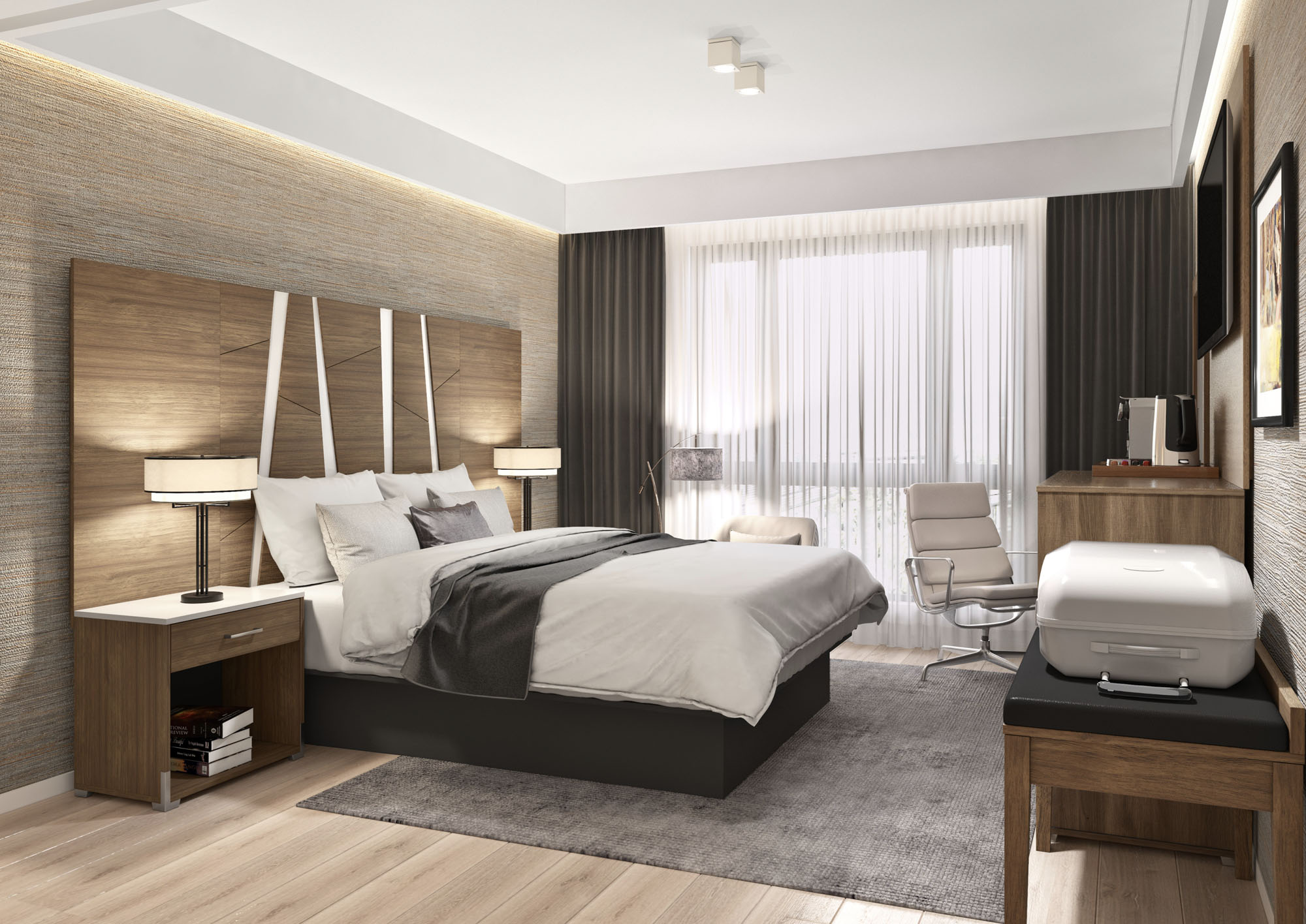 fresh perspective to hospitality furnishings. Shown in walnut finish with brushed steel